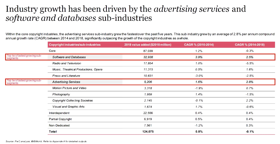 The software and databases sub-industry has more than doubled the average growth rate of other copyright industries across the board. The value of the advertising industry also grew by an average of 2.8% per annum between 2014 and 2018[3], outpacing the overall growth of other categories overall, as shown in the below extract from the Report: