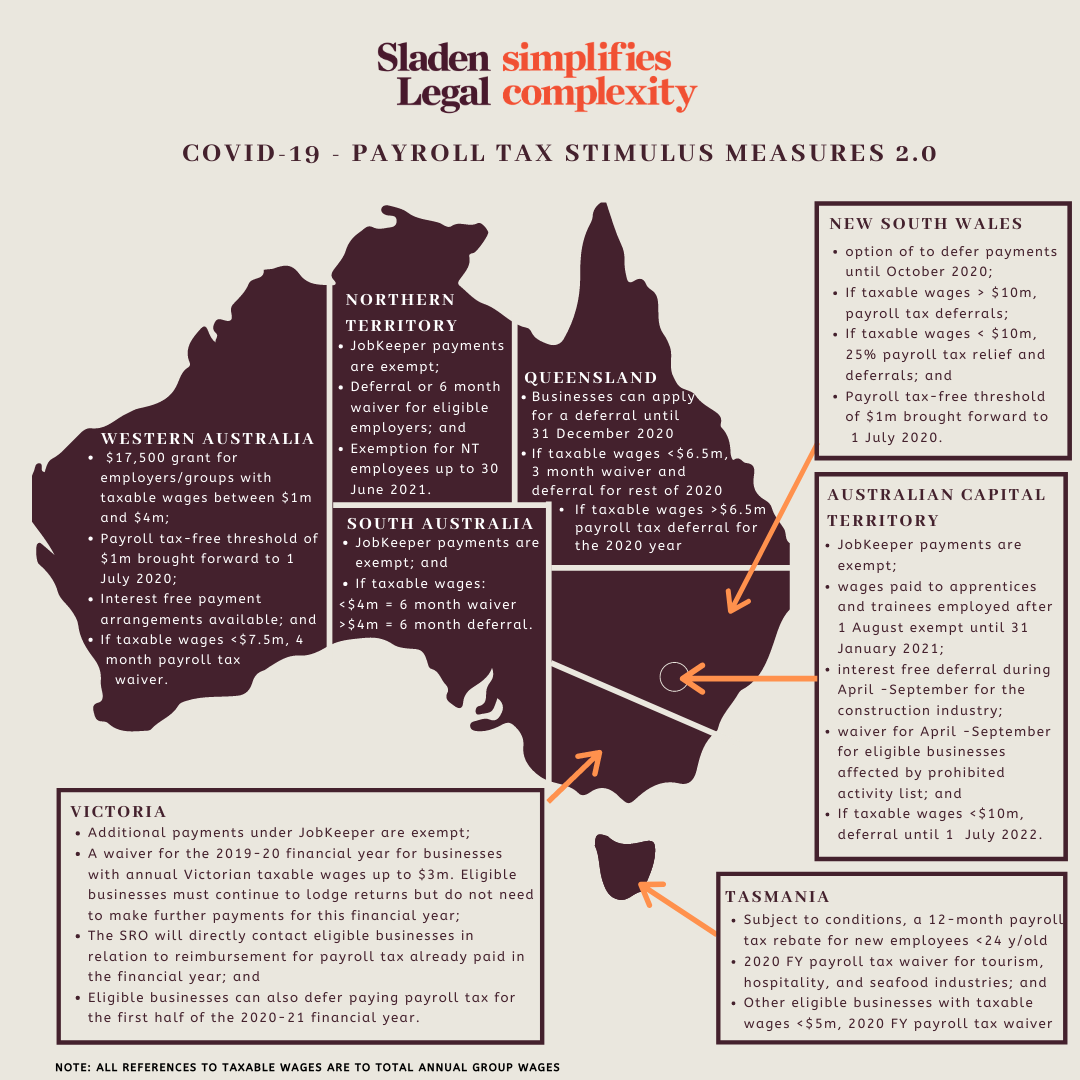 As we previously reported here, the Victorian Government announced in March a payroll tax waiver for eligible Victorian businesses suffering as a result of COVID-19. A subsequent announcement in May resulted in additional payments made under the JobKeeper program being exempt from payroll tax. We provided further details on this measure here.
