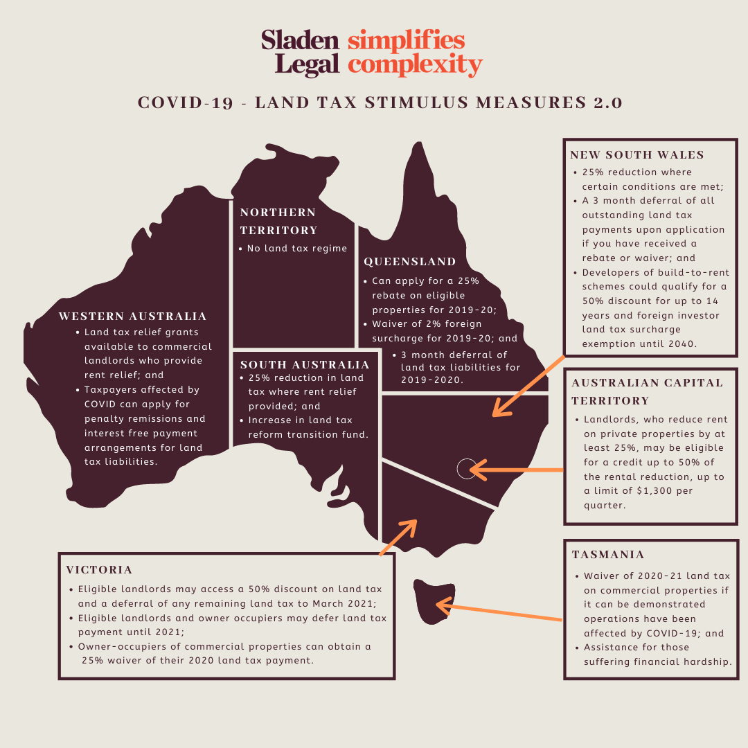 a 25% reduction on 2020 land tax assessments where landlords provide rent relief to tenants impacted by COVID-19;