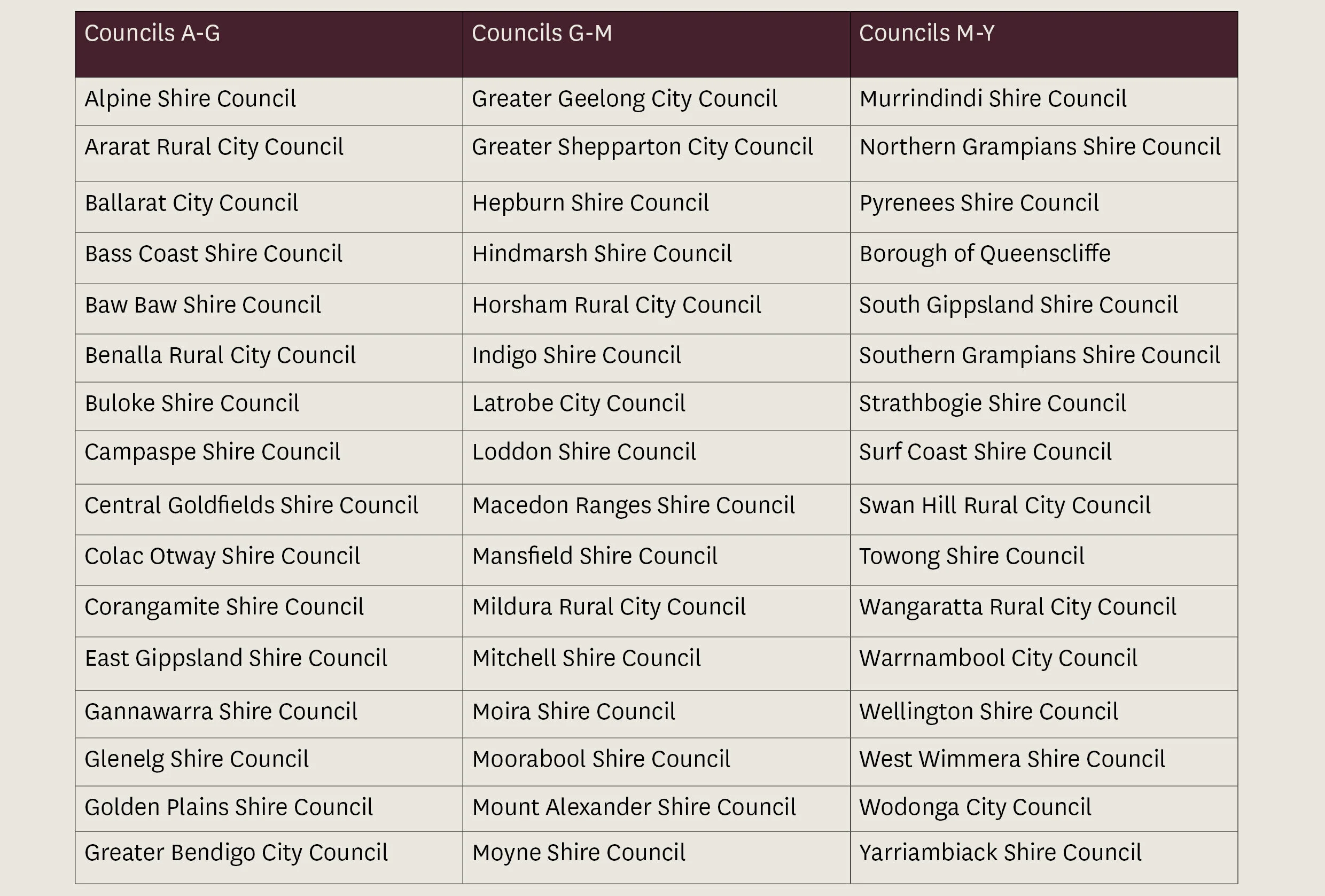 Regional Victoria is defined to include a certain regional councils. The qualifying regional councils are listed in the table below.