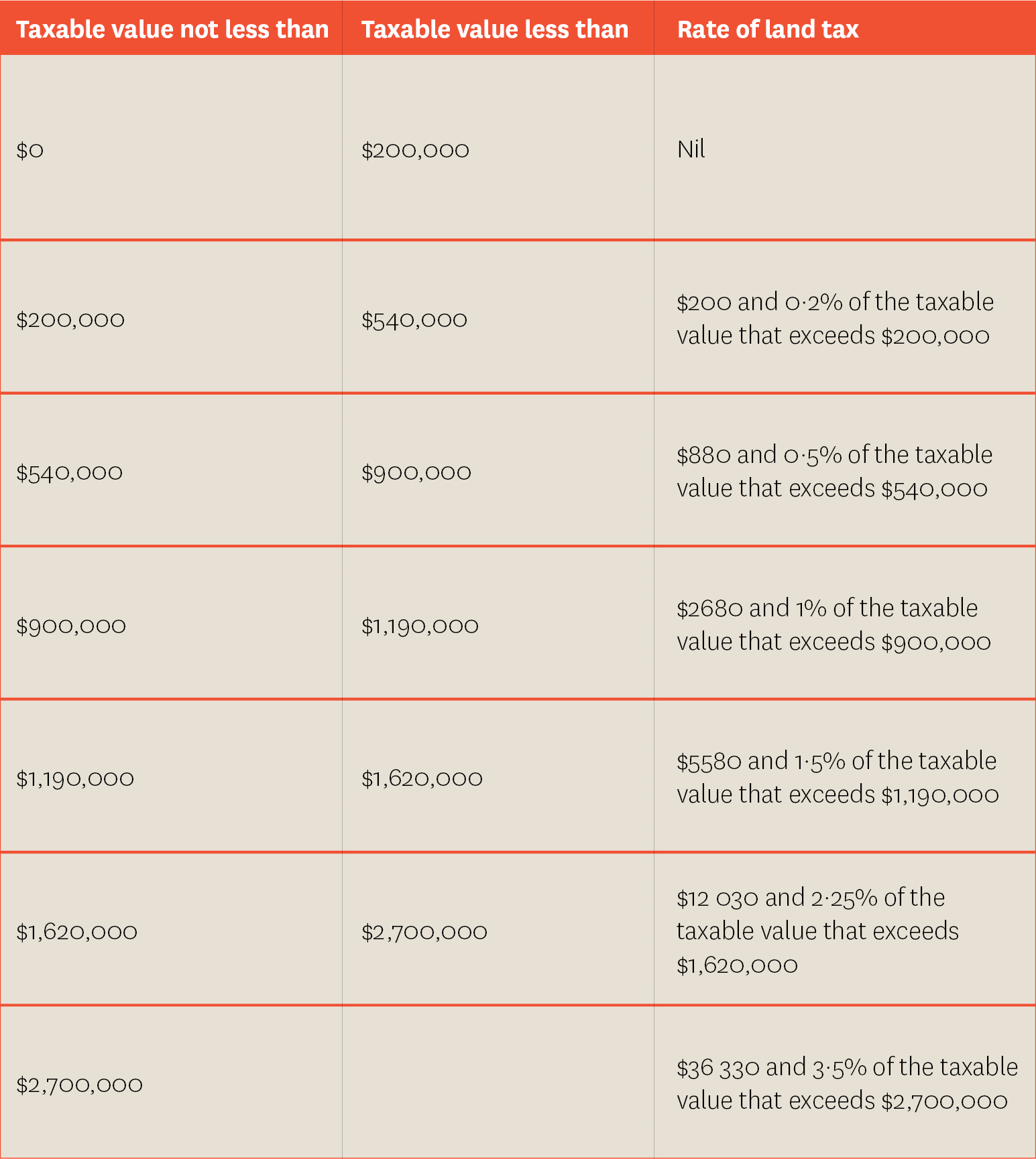 When an entity’s taxable value of all land owned in the particular state or territory exceeds the threshold, land tax is levied at the applicable rates.