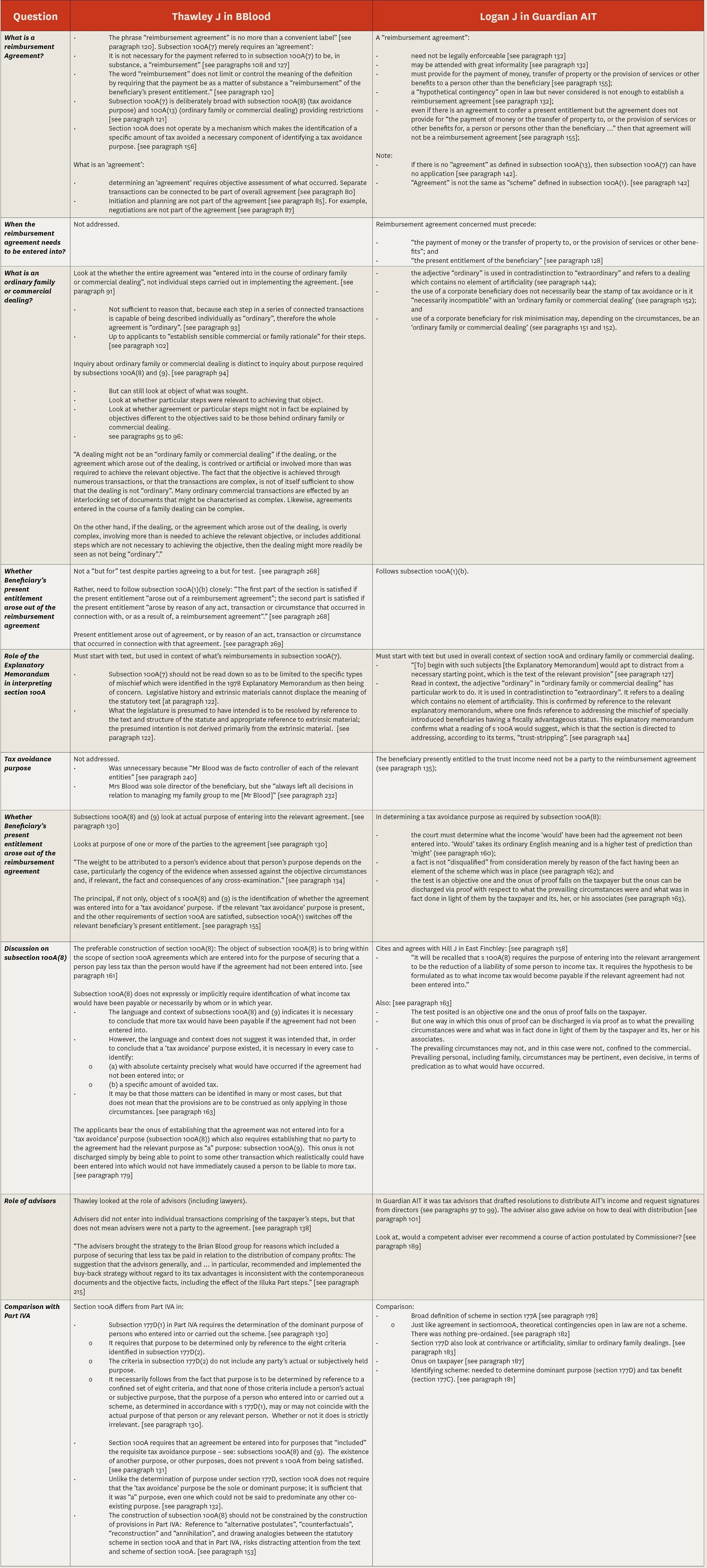 At the date of writing, we do not know if the taxpayer will appeal the decision of Thawley J in BBlood. The ATO appealed the Logan J decision in Guardian AIT and that appeal has been heard (decision pending). The table below looks at what Thawley J and Logan J said on various aspects of section 100A. However, care should be exercised in drawing broad conclusions as the comments were in the context of the facts of the specific cases.