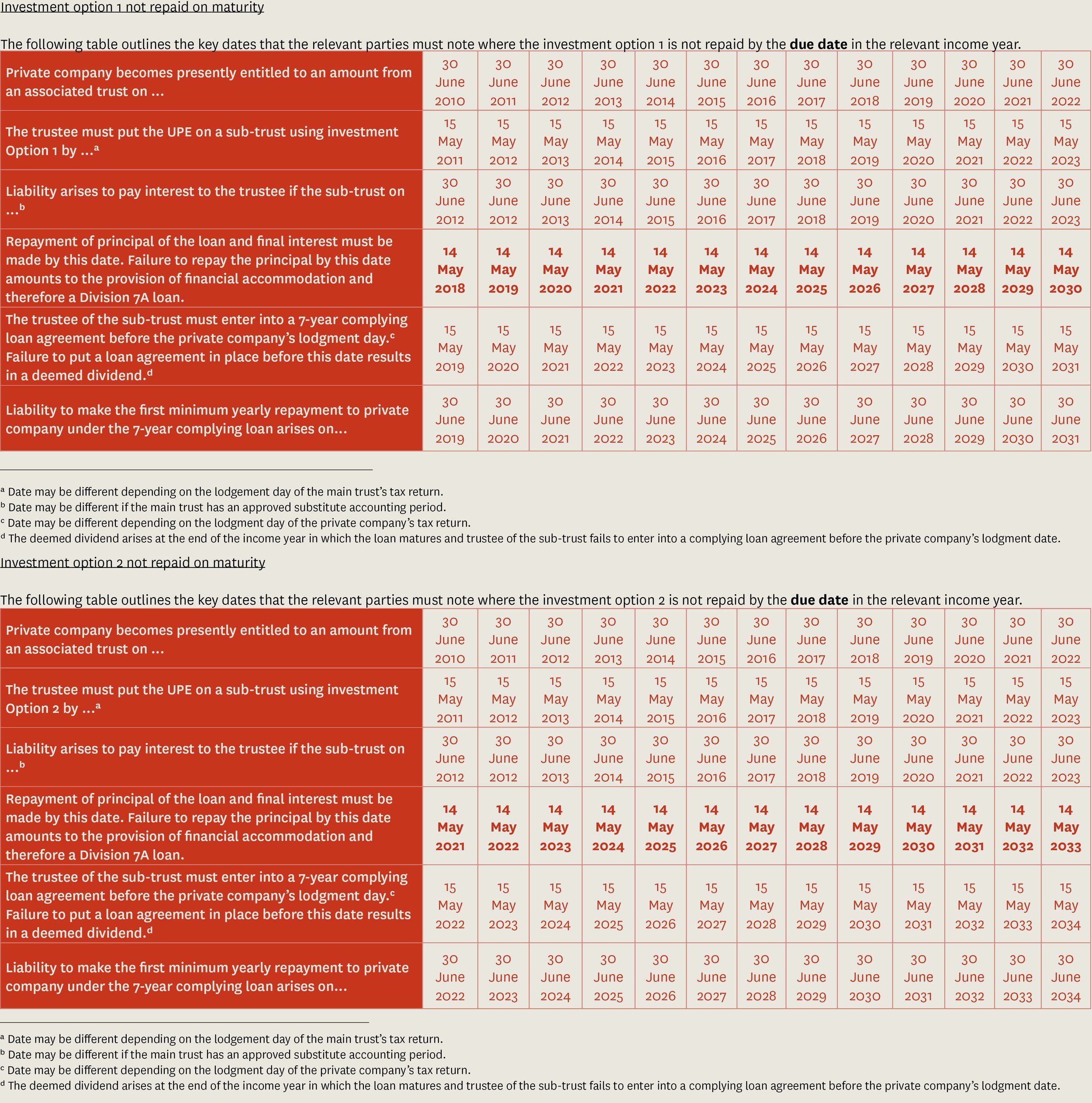 On 7 June 2022, by updating PCG 2017/13 the ATO answered ‘yes’ to both questions and included the following tables for Option 1 and / or Option 2 arrangements that mature after 30 June 2022.
