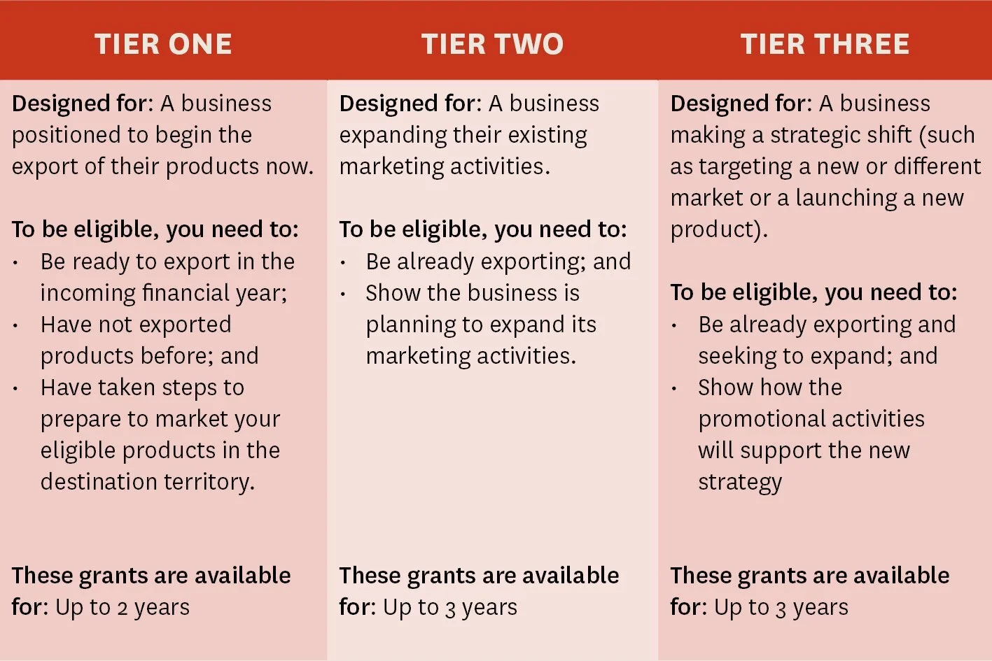 The EMDG is offered in three different ‘tiers’ depending on which stage of exporting the business is in.