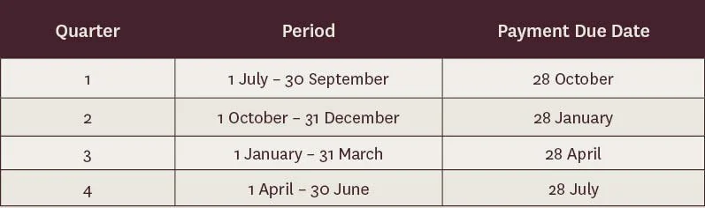 To avoid late payments and therefore to trigger the Super Guarantee charge, Super Guarantee contributions must be made quarterly, within 28 days after the end of the relevant quarter, as shown in the table below: