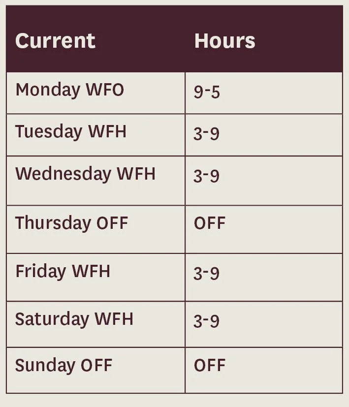 Ms Quirke received no formal written response to her email, though she did exchange messages on Microsoft Teams about it with her manager. She then emailed BSR’s HR Manager her “ideal roster”, which was the following: