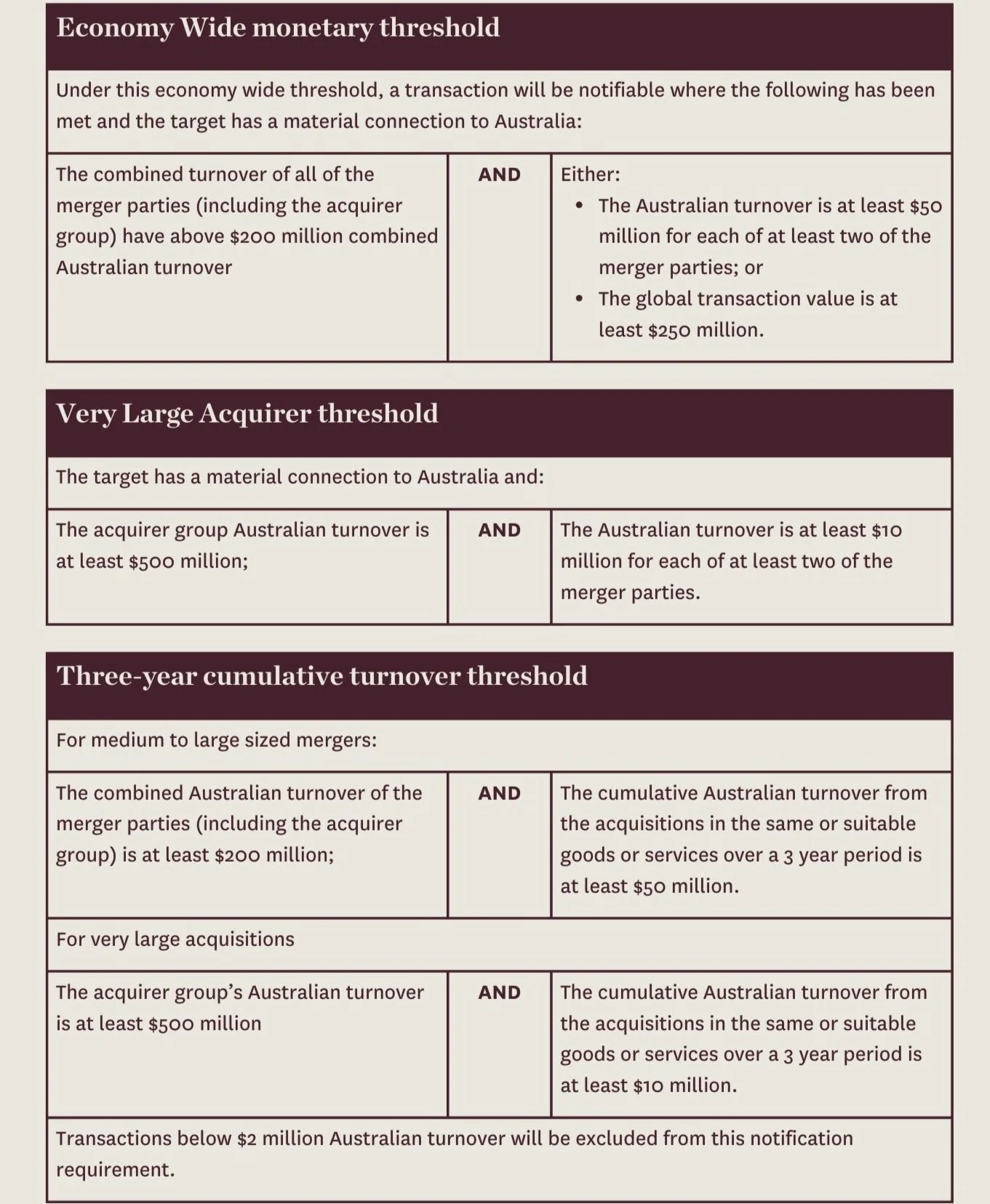 The reforms introduced by the new legislation aim to preserve competition within markets through the mandatory review of proposed mergers by the Australian Competition and Consumer Commission (ACCC). Such mandatory reviews will be triggered by monetary thresholds based on transaction value and the turnover of transaction participants.